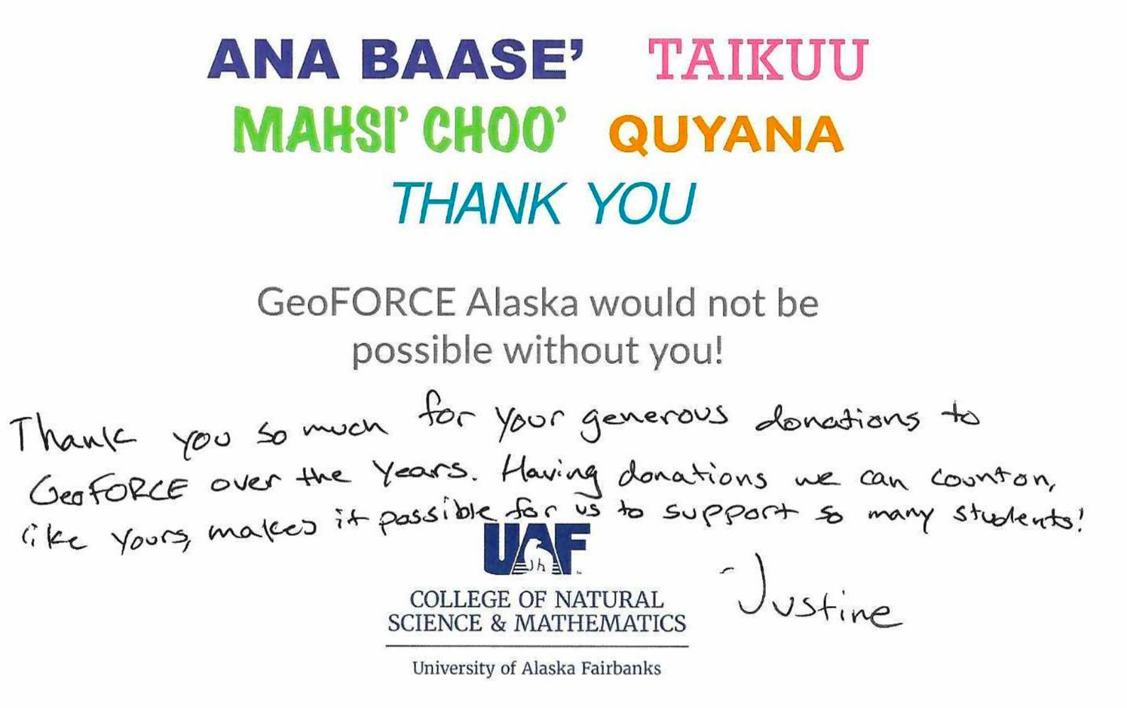 We are especially proud to support GEOFORCE Alaska, a transformative outreach program at the University of Alaska Fairbanks that introduces rural high school students from the North Slope, Northwest Arctic, and Interior regions to the world of geoscience. Students join the program in 8th or 9th grade and embark on a four-year journey that includes summer geology academies in places like Denali National Park, the Grand Canyon, and Yellowstone. The goal: to spark and sustain interest in science, technology, engineering, and math (STEM) fields, boost high school graduation rates, and build a more diverse, homegrown technical workforce in Alaska.
