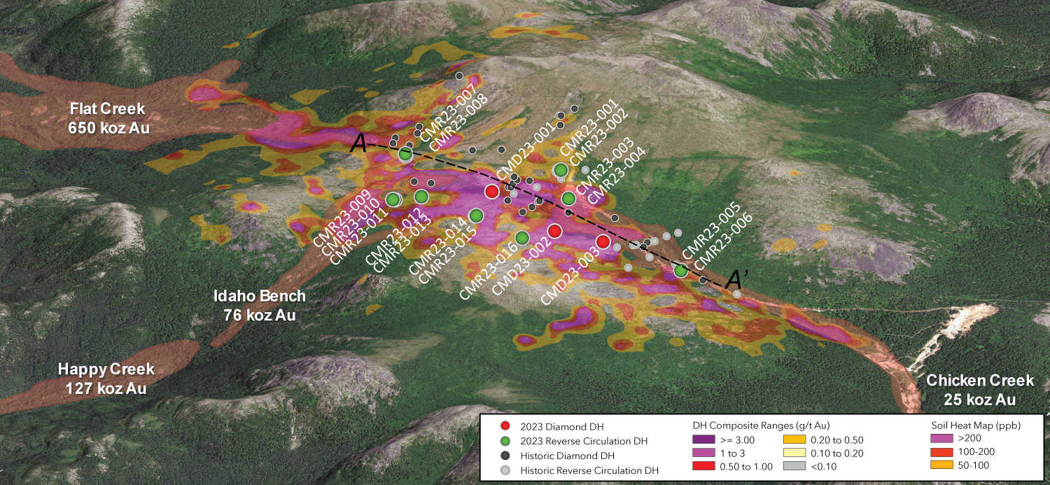 - 24.39m of 1.09 g/t Au within a broader mineralized interval of 76.20m at 0.55 g/t Au and ending in mineralization (CMR23-008) representing a 102.00m step out from the closest historical collar