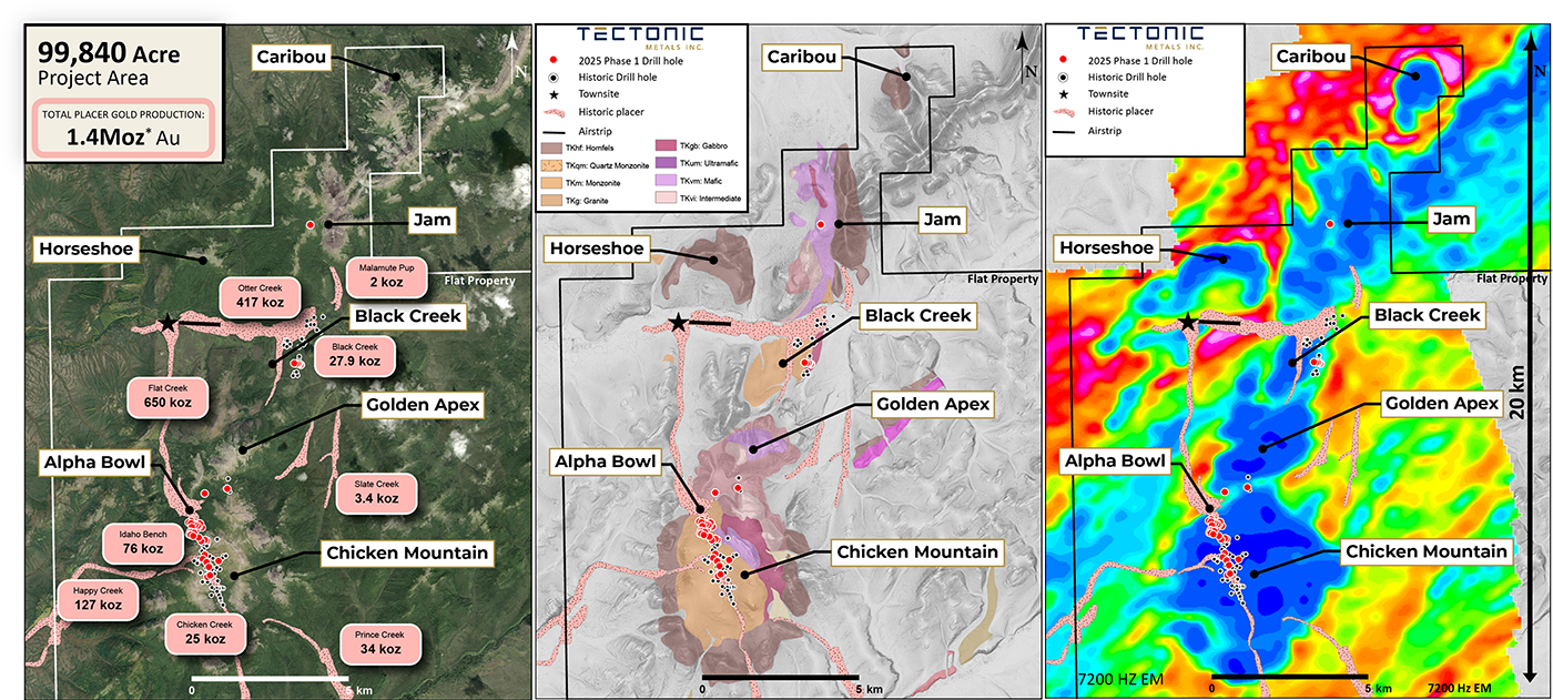 There are six district or kilometre scale intrusion-hosted gold targets (Chicken Mountain, Golden Apex, Black Creek, Horseshoe, Jam, and Caribou) on Flat’s land package, the primary target at being Chicken Mountain.